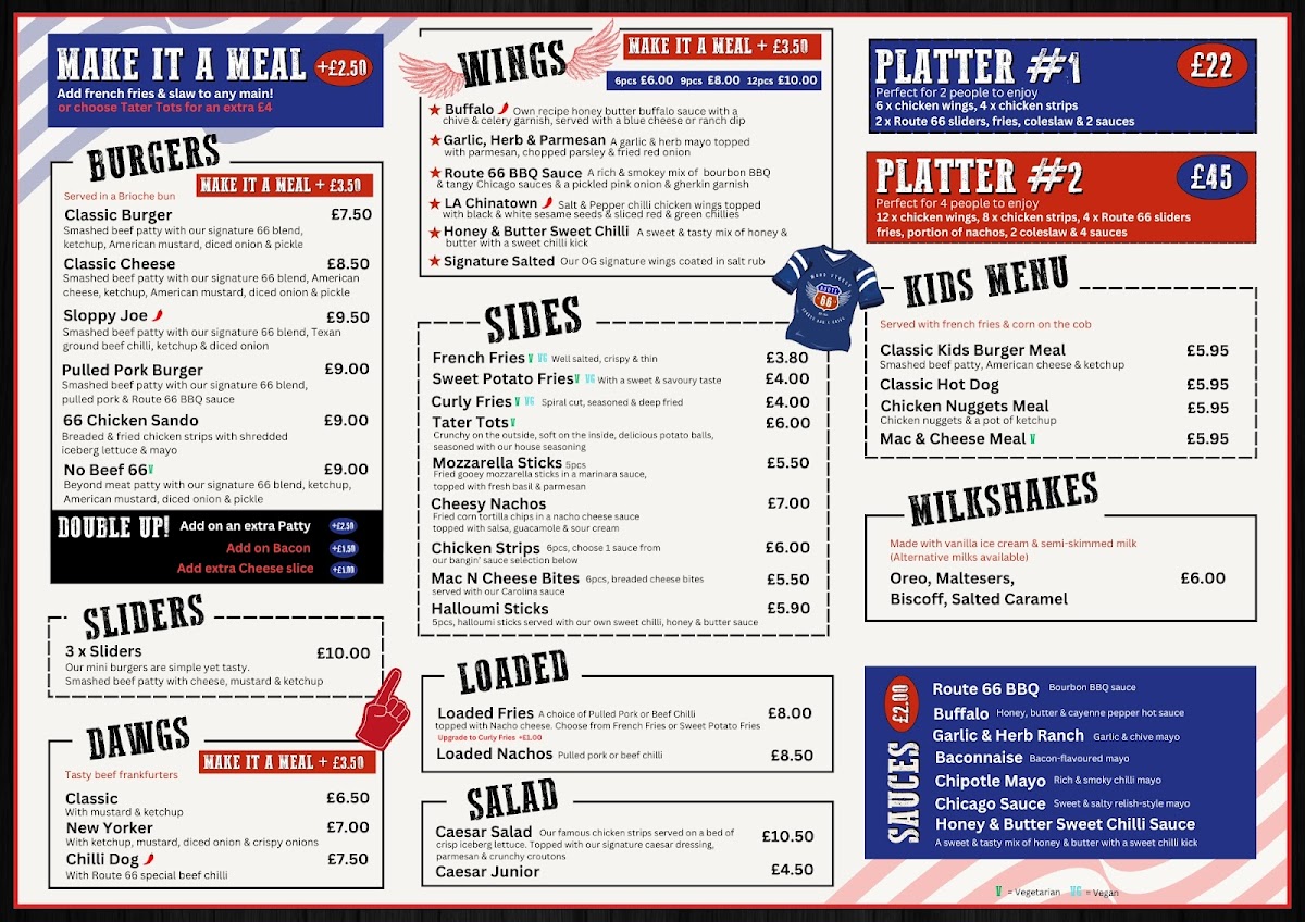 The Route 66 (Swindon) Menu offers a nostalgic yet vibrant slice of Americana right in the heart of Swindon, at 25-27 Wood Street. This diner-styled eatery is a homage to the legendary highway it’s named after, capturing the essence of classic American comfort food with a modern twist. From the moment you step inside, the retro decor and upbeat atmosphere set the tone for an authentic dining experience that’s both casual and memorable.