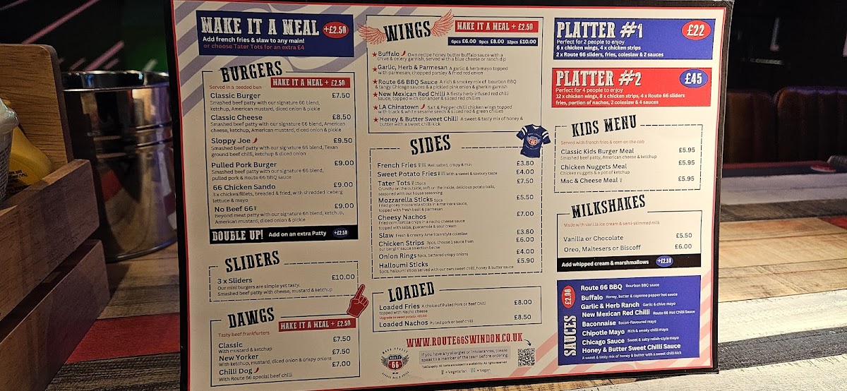 In comparison to competitors in the area, Route 66 stands out for its immersive theme, lively ambiance, and reliable food quality. Whether you’re craving a full American feast or just a quick bite, the Route 66 (Swindon) Menu delivers with charm and substance.